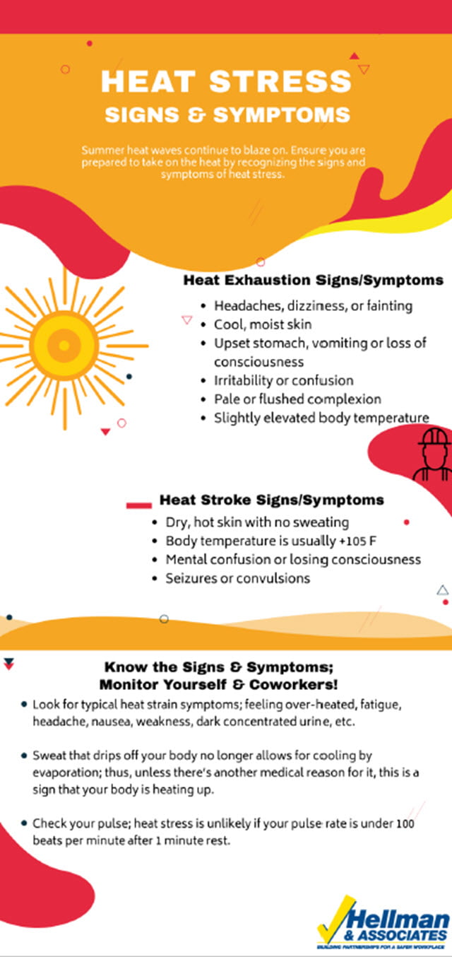 The U.S. is experiencing yet another week with heat waves expected across the country, exposing outdoor workers to dangerous risks related to heat exposure. Hellman & Associates has developed a handy infographic that you can post at your workplace and share with your employees to help them identify the signs and symptoms of heat stress so they know when to cool down before serious health risks set in.